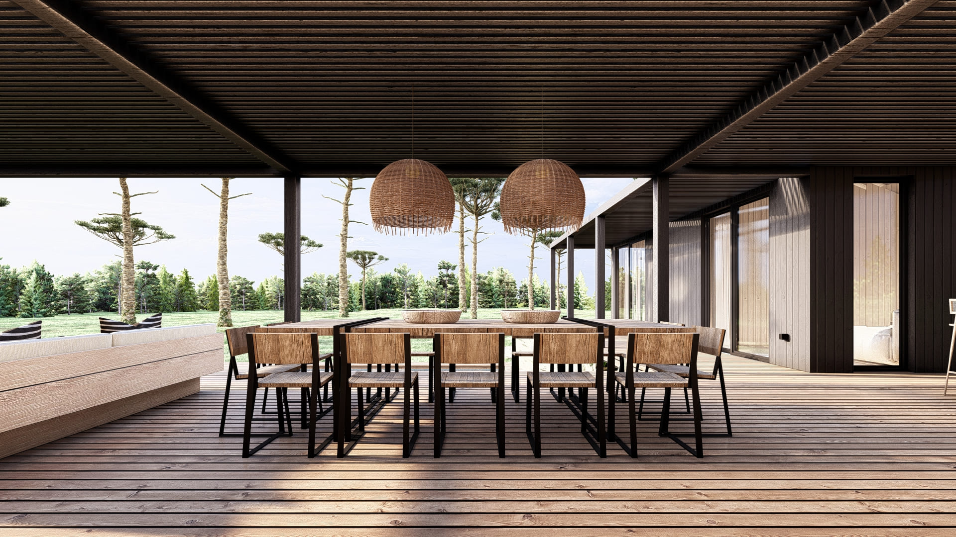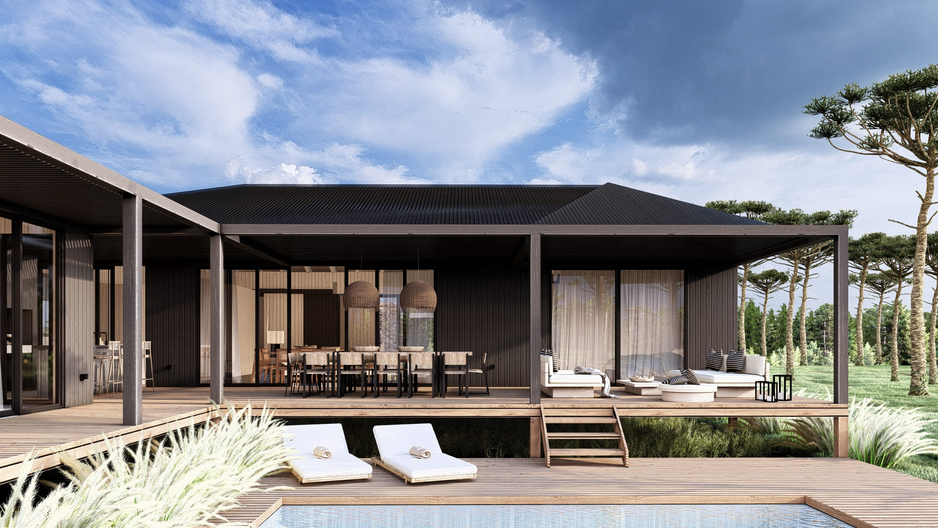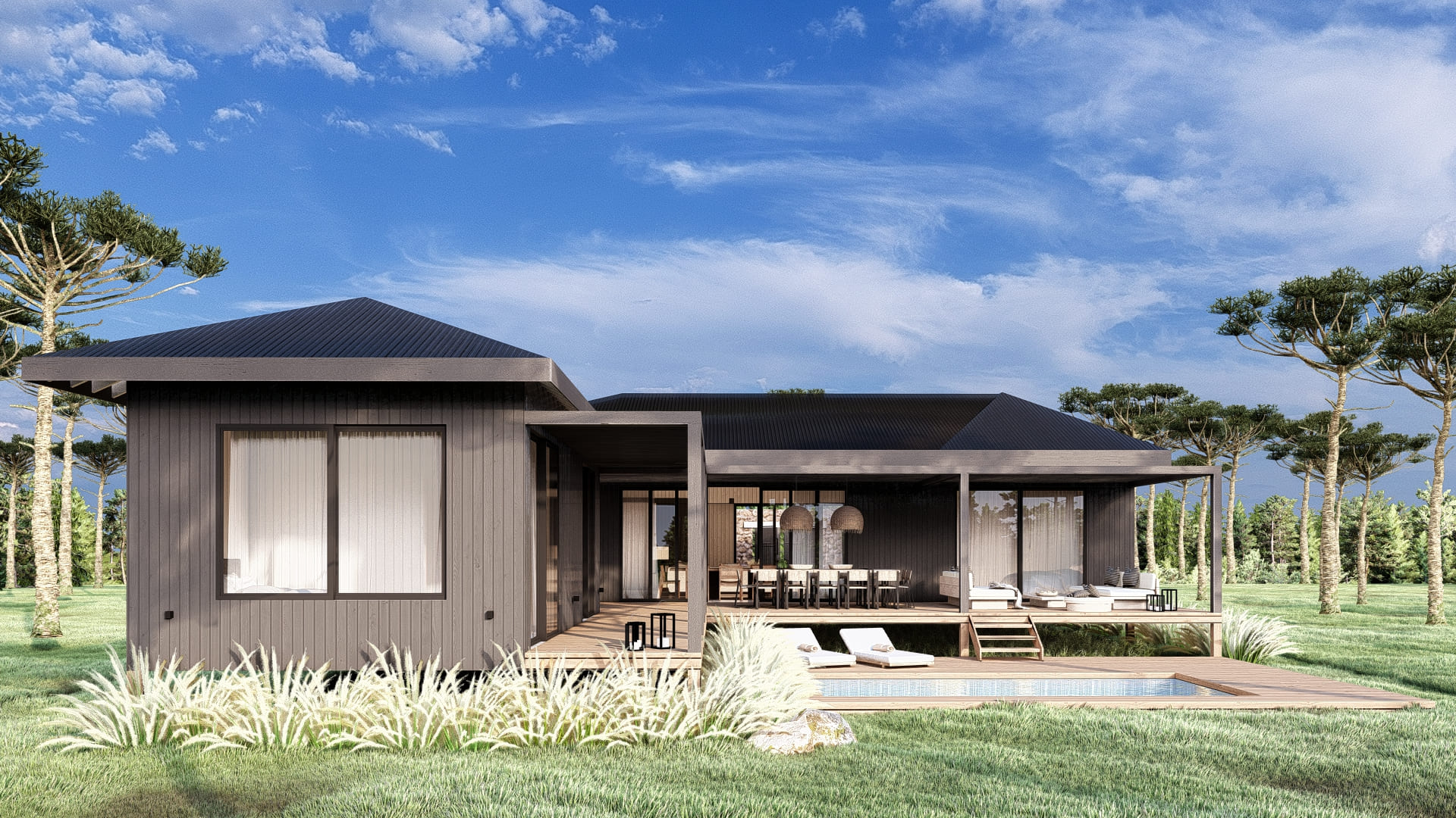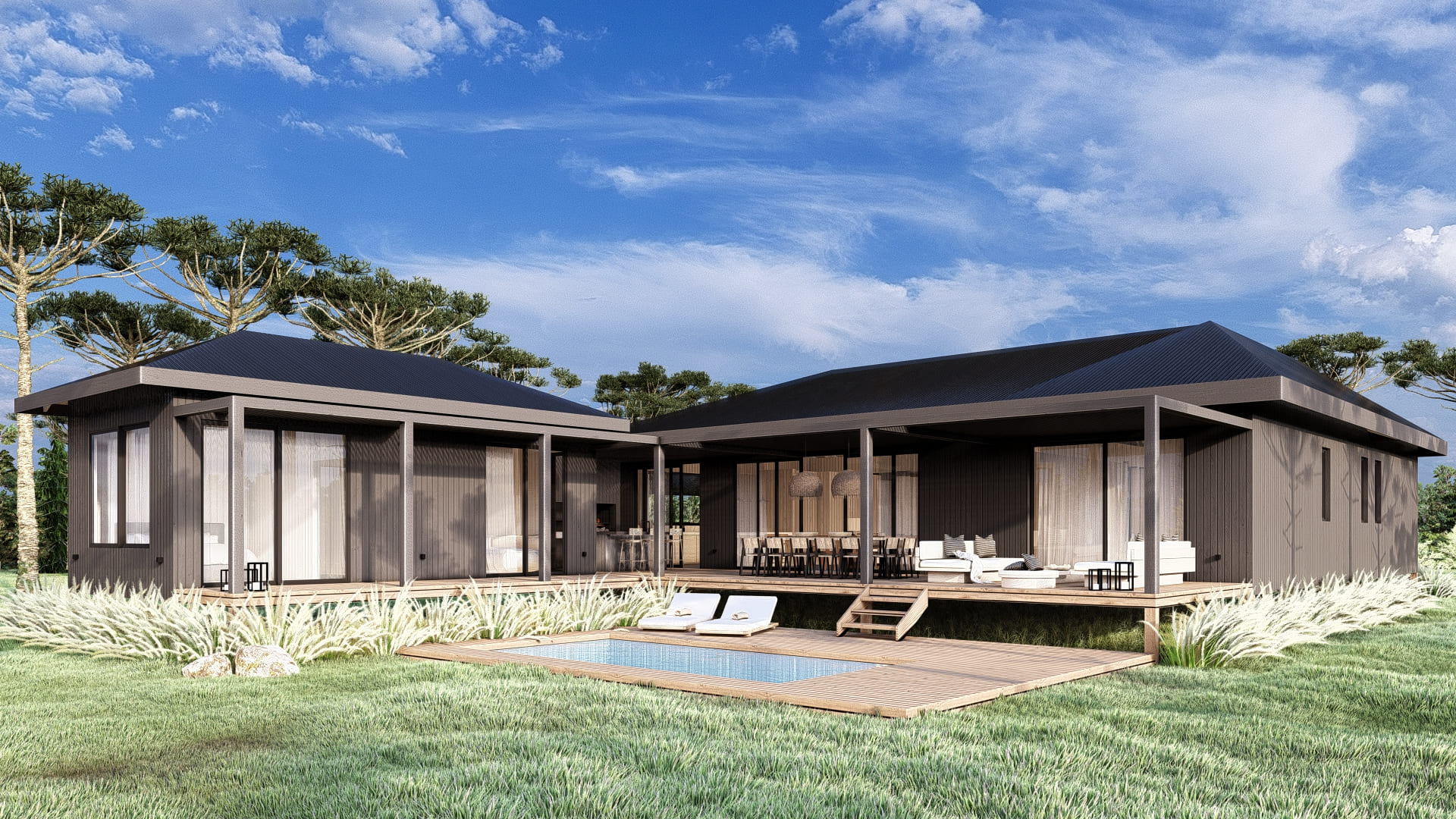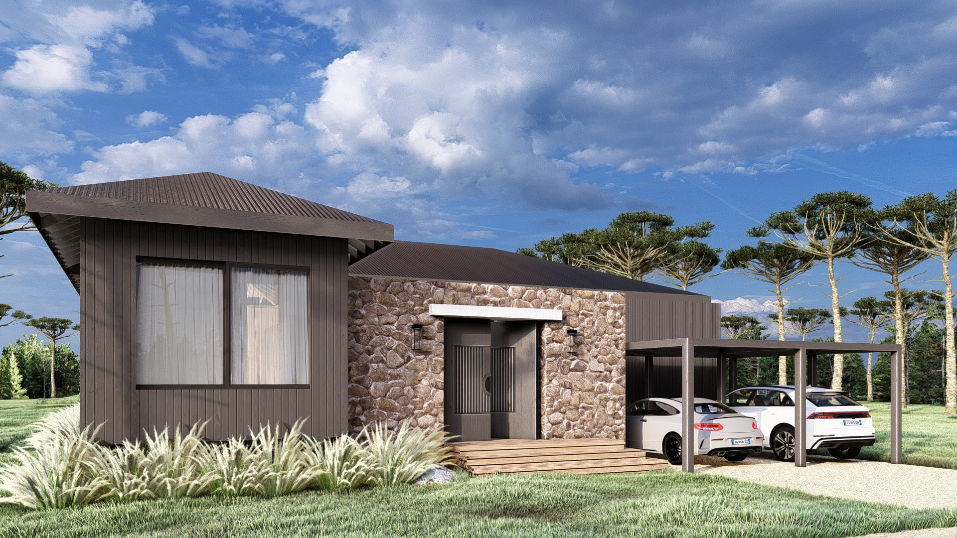 Designed on a single level, this house features a main module and one fully independent module. They are connected through the gallery, creating a courtyard with optimal orientation and views.
