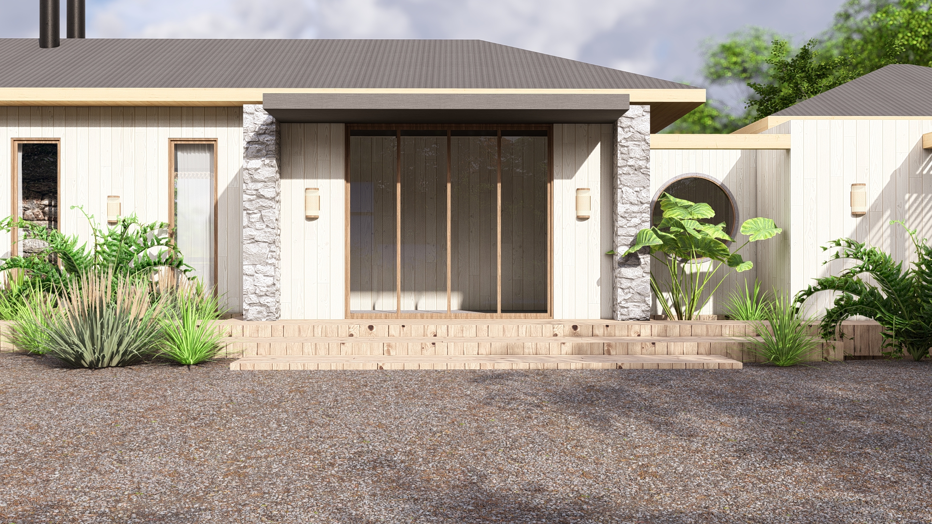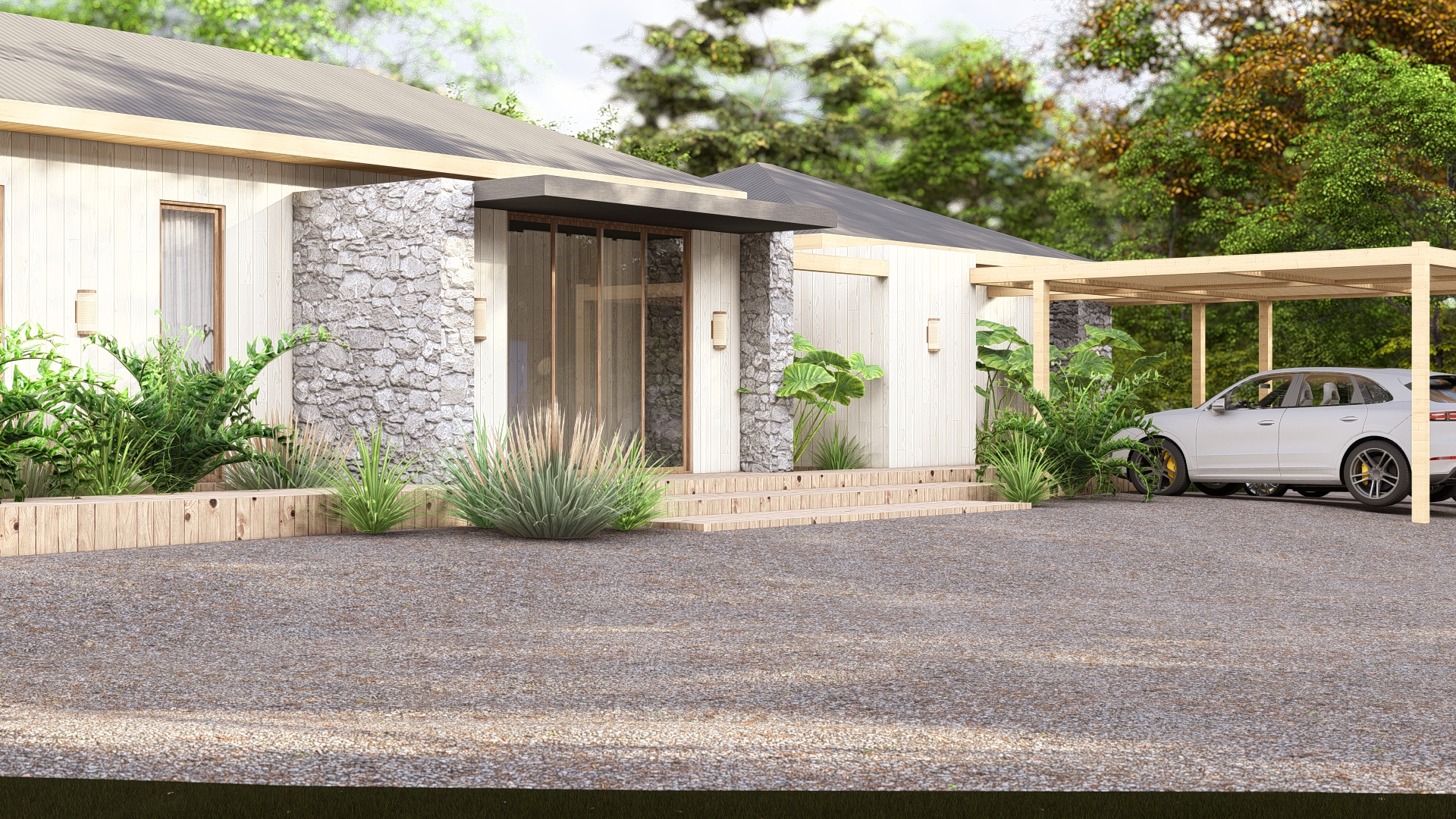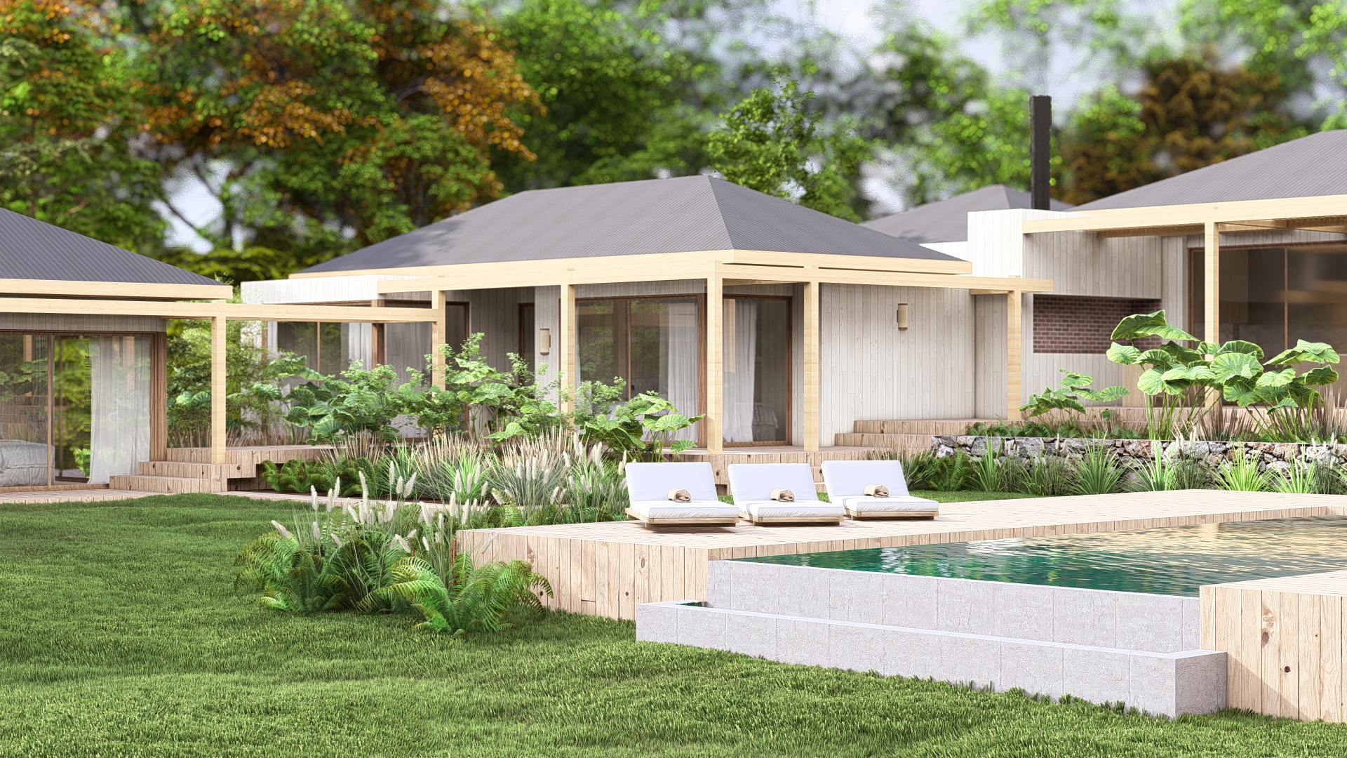 Esta casa de campo está proyectada buscando las mejores visuales y la mejor orientación. Es así como se pensó en un gran volumen principal y 2 volúmenes totalmente independientes entre ellos. Todos estos están implantados de forma tal que acompañan a la curva natural del terreno. La galería con las visuales hacia la piscina y las diferentes pérgolas son las que unen todos estos volúmenes.