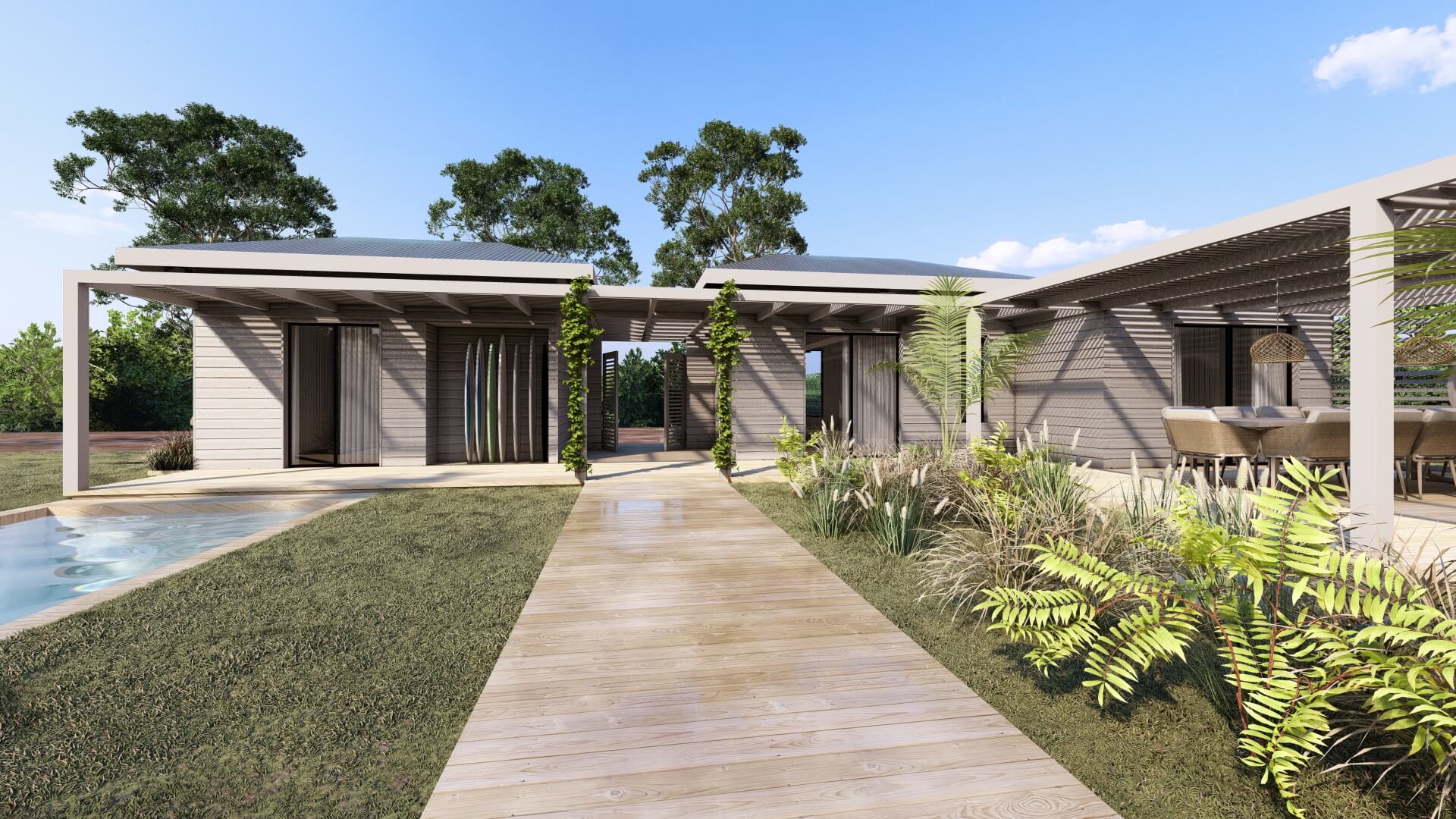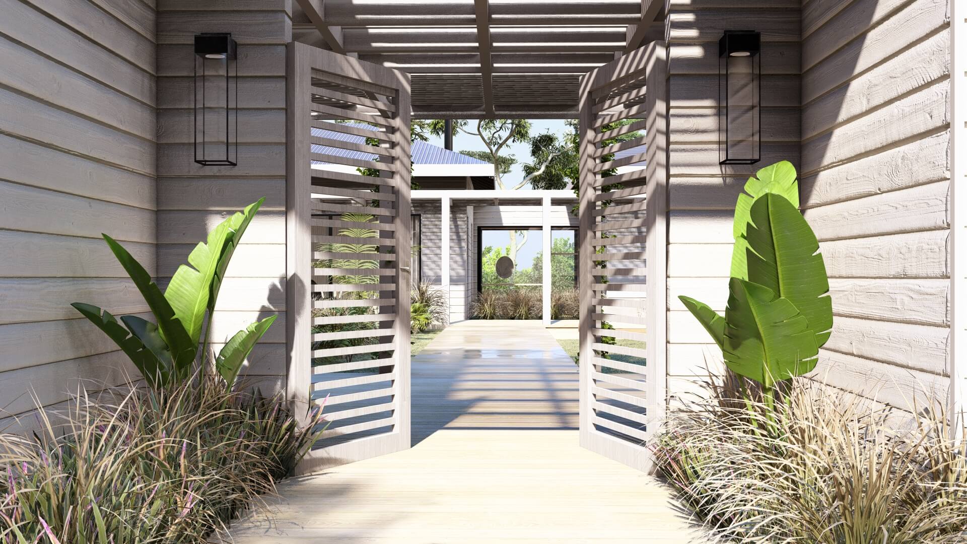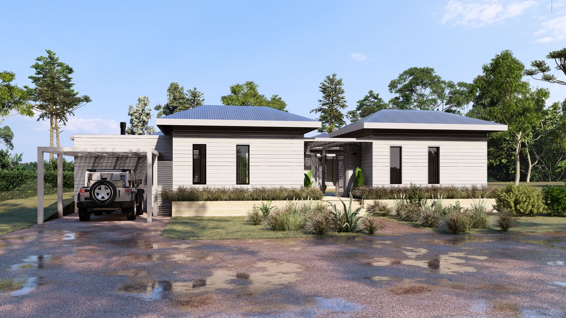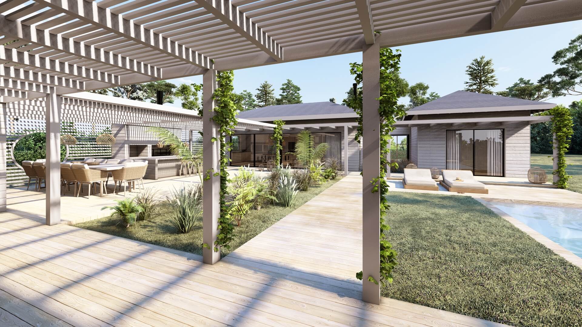 En el proyecto se plantean tres volúmenes independientes conectados entre sí mediante una pérgola semicubierta. El volumen principal se ubica en el fondo del terreno y los otros dos restantes conforman el frente generando así un jardín central con la intención de iluminar y oxigenar el pulmón de la casa, como así también funcionar como punto de distribución a las distintas zonas de esta.
