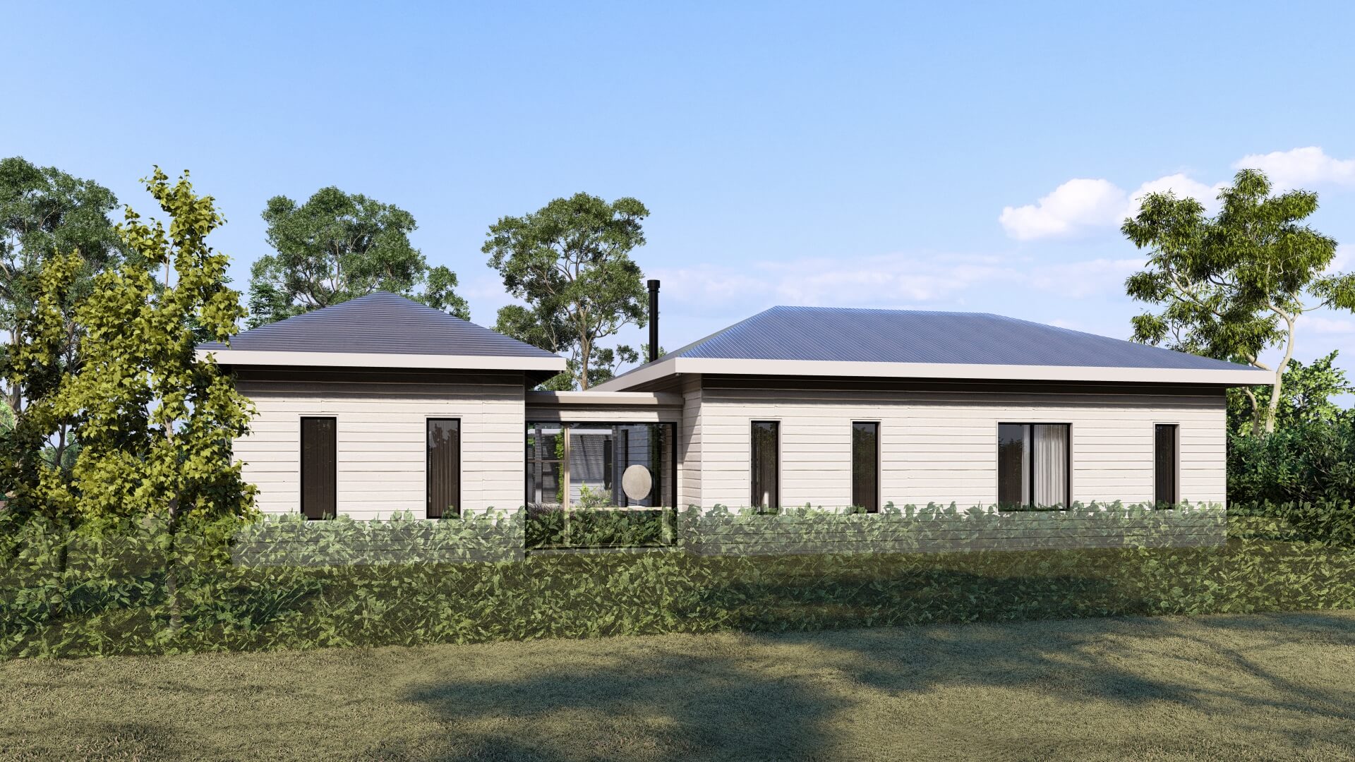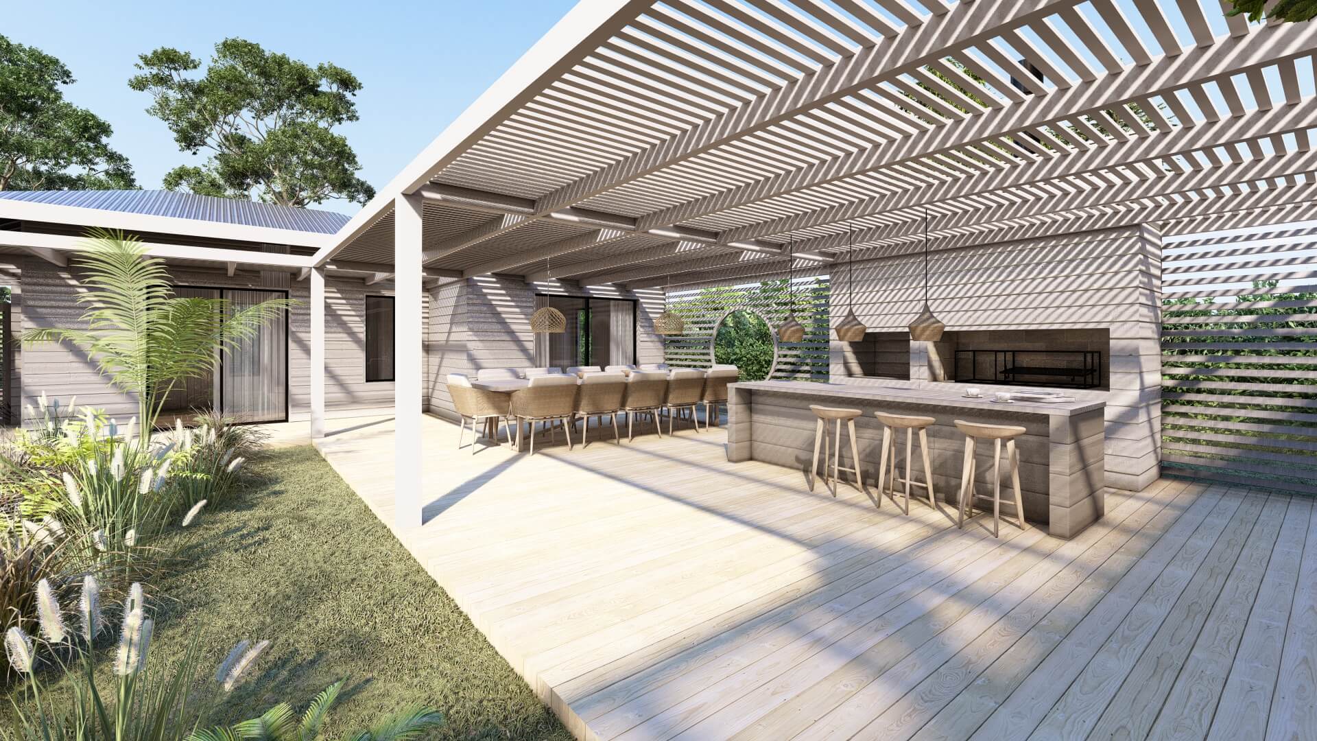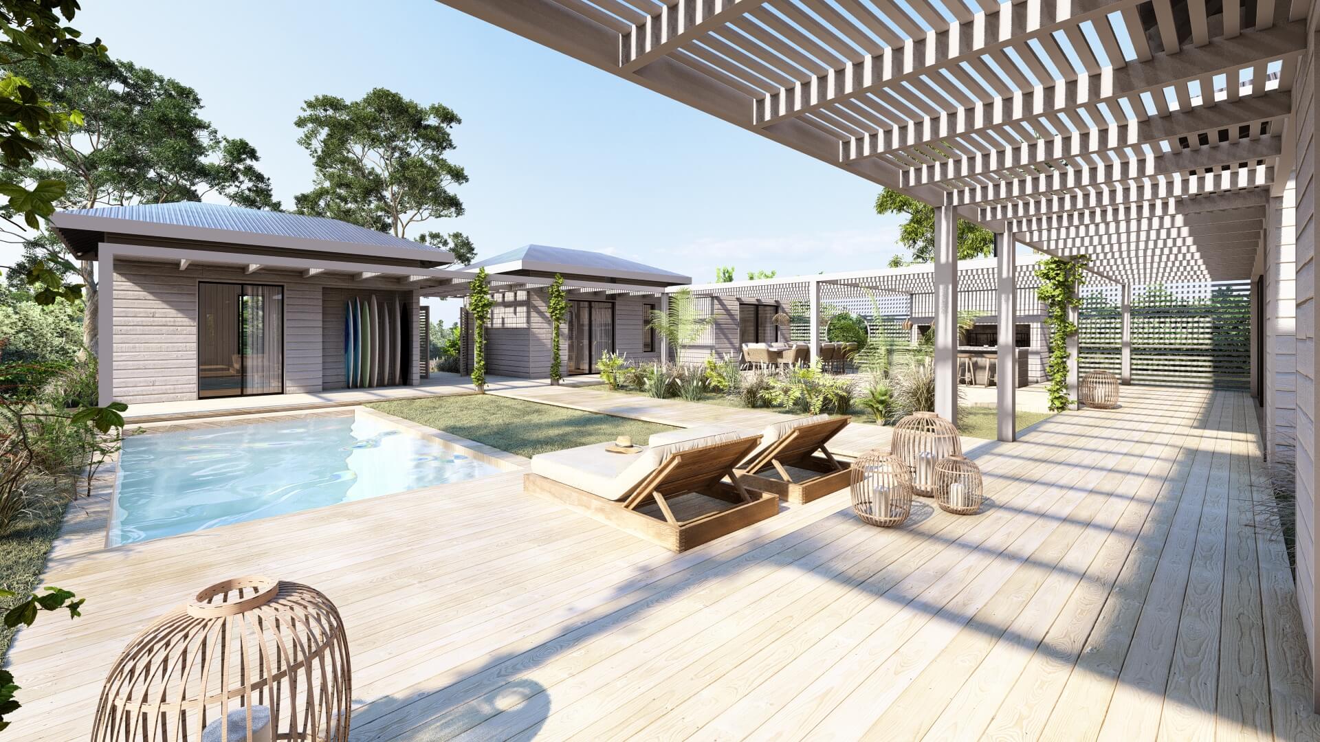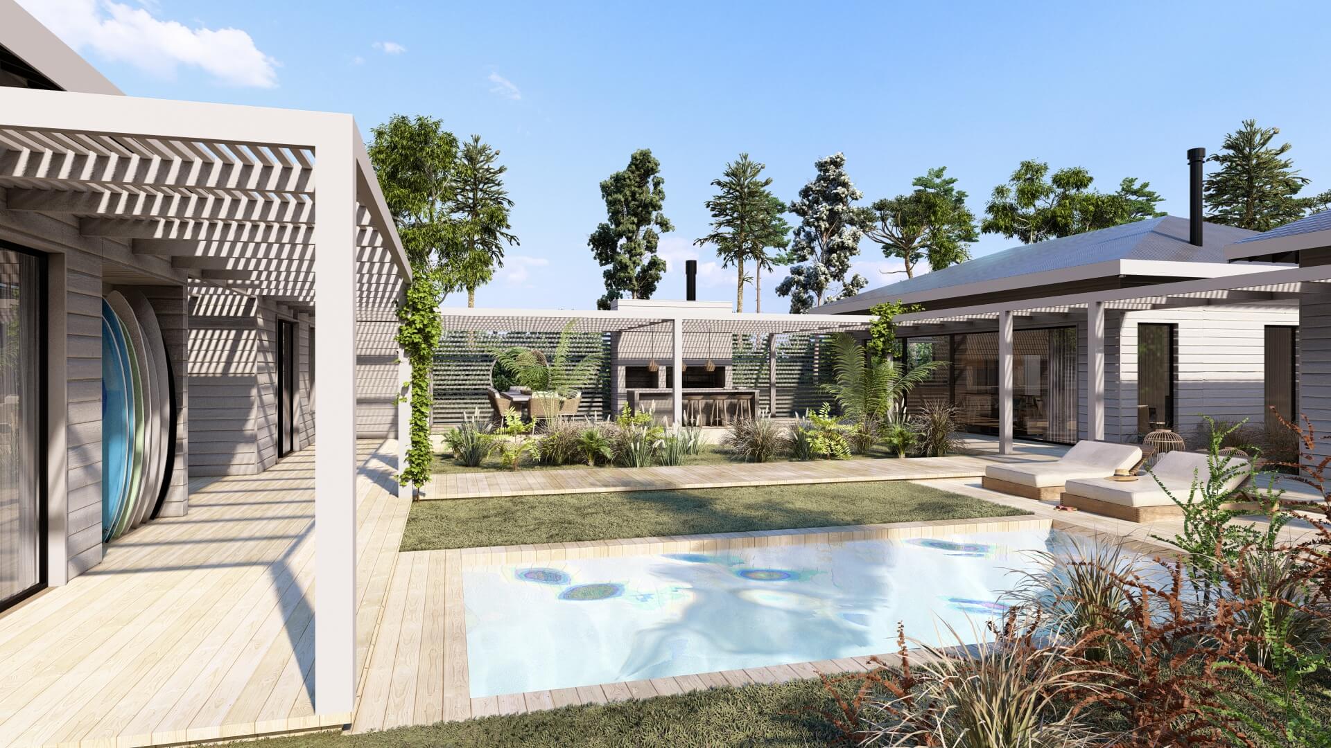 En el proyecto se plantean tres volúmenes independientes conectados entre sí mediante una pérgola semicubierta. El volumen principal se ubica en el fondo del terreno y los otros dos restantes conforman el frente generando así un jardín central con la intención de iluminar y oxigenar el pulmón de la casa, como así también funcionar como punto de distribución a las distintas zonas de esta.